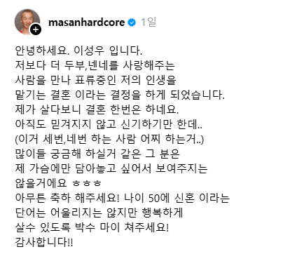 올해 나이가 만 48세라고 하는데, 드디어 결혼을.
