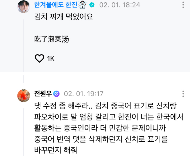김치가 "파오차이"라고? 투어스 중국인 멤버, 한진 망언 논란