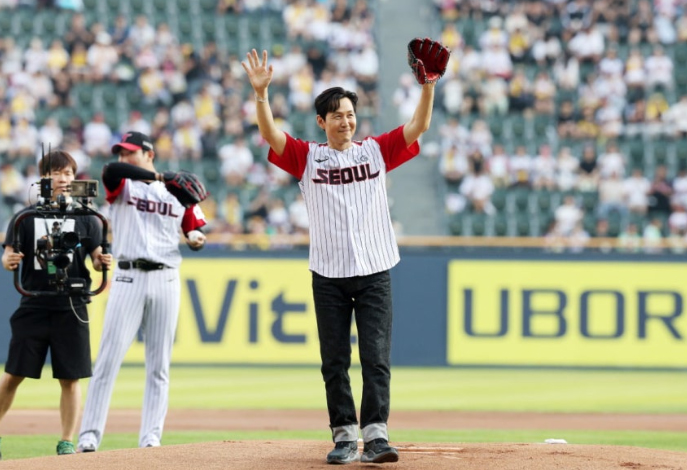 이정재는 극중에서 시구를 하고, 관중석에선