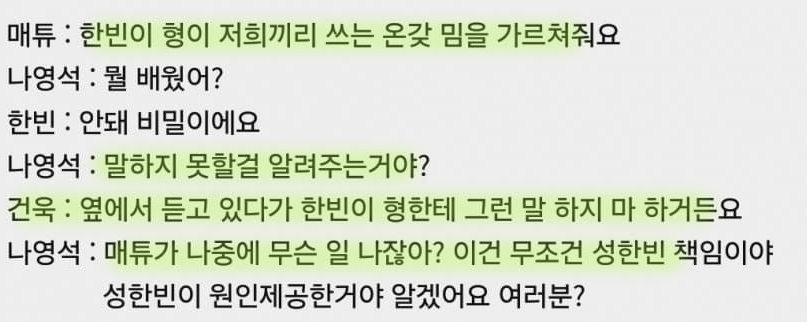 매튜 : 한빈이 형이 우리끼리 쓰는 온갖밈을 갈쳐준다