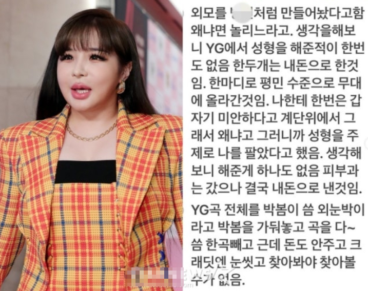 성형을 할때 yg에서 돈을 안내줘서 박봄