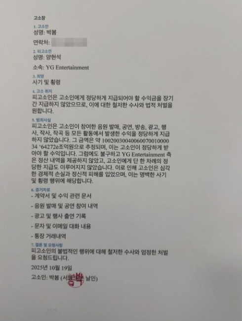 고소장을 찍어 올린 박봄이, 이번에는 고소는