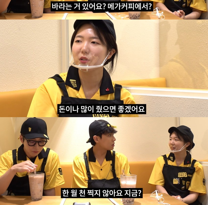 촬영하러가서, 메가커피 알바생에게 월급관련 대화를 해요.