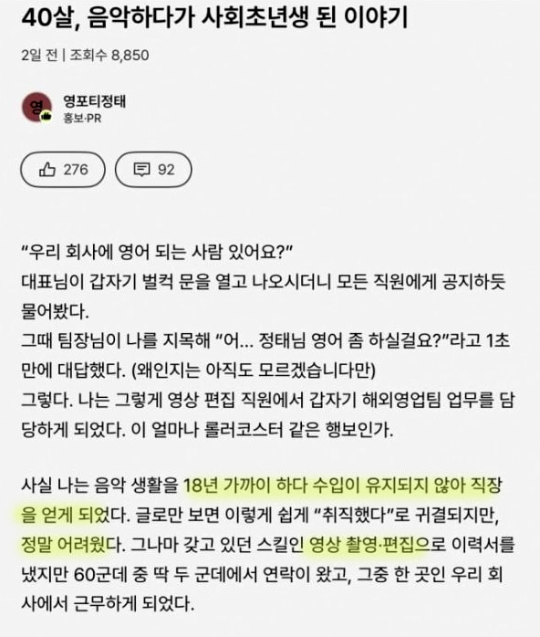 취업 후기 글을 올려서 나름 화제가 되고 있더라구요.